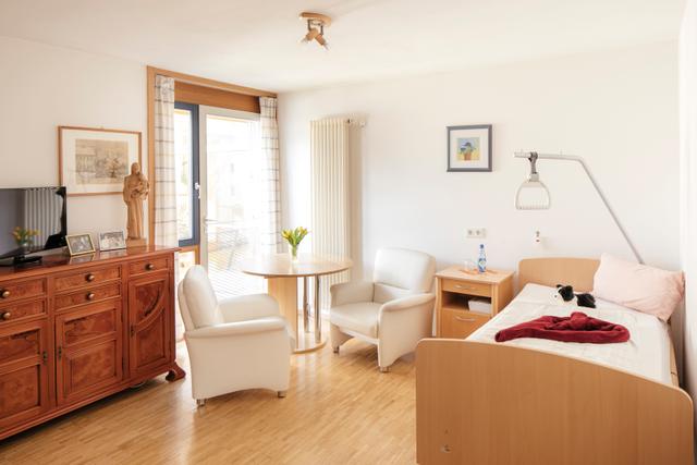 Die hellen und freundlichen Zimmer sind nur mit einem Pflegebett und einem Nachttisch ausgestattet, damit die Bewohner*innen eigene Möbel mitbringen und sich ganz nach ihren persönlichen Wünschen einrichten können. Selbstverständlich haben alle Zimmer